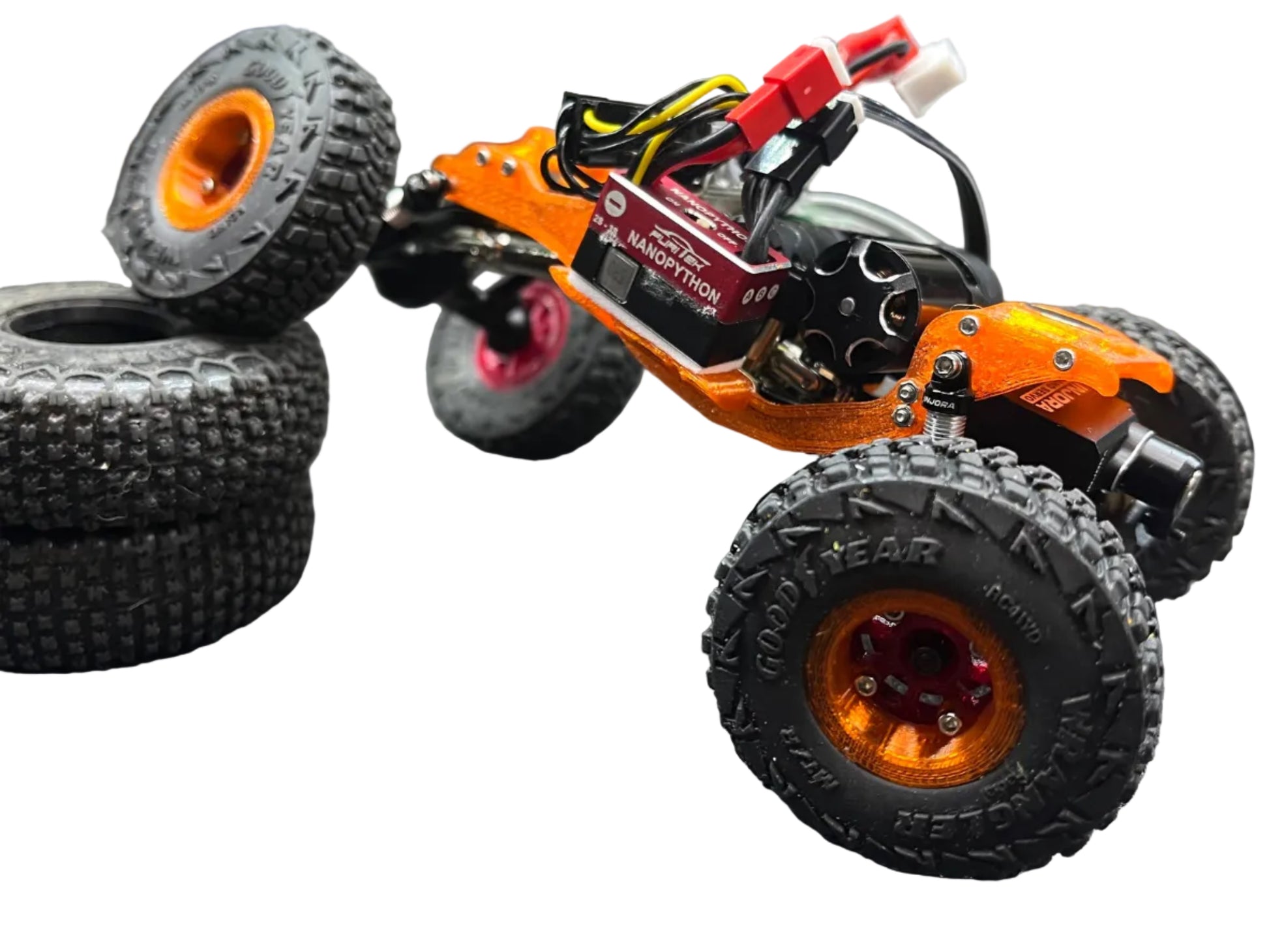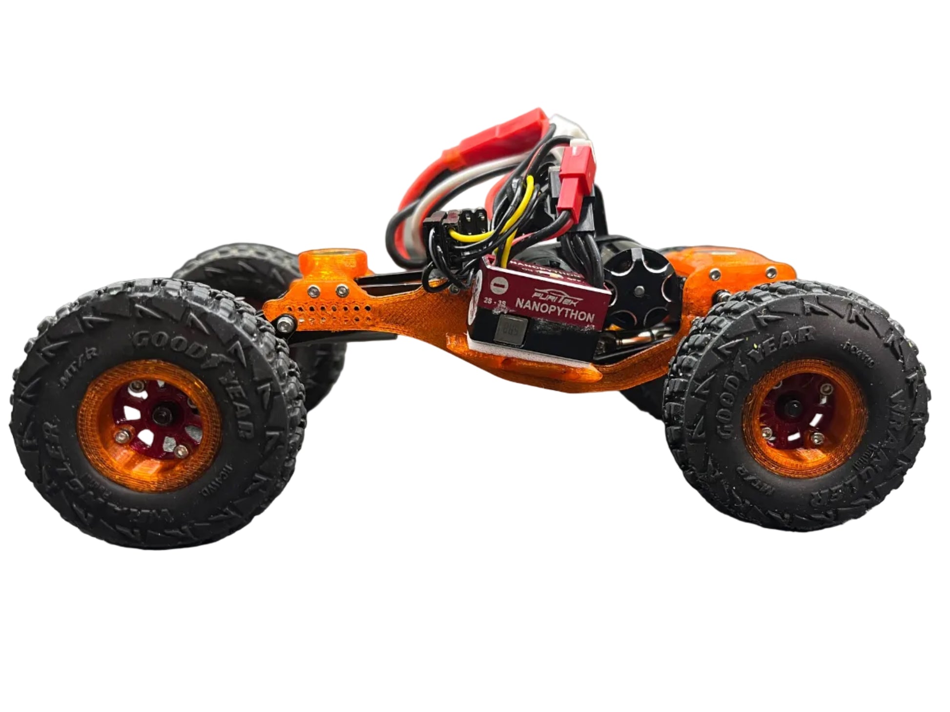 A low center of gravity design with HUGE rear clearance! 3D printed from PRO-PTCG featuring a 13° skid angle, this chassis was built for competition. The rear links mount up high to a separate mount above the driveshaft, allowing for increased break over clearance as well as extended wheelbase. (Rear link mount also acts as an electronics mount). 2 side electronics plates are added for use of aftermarket electronics.